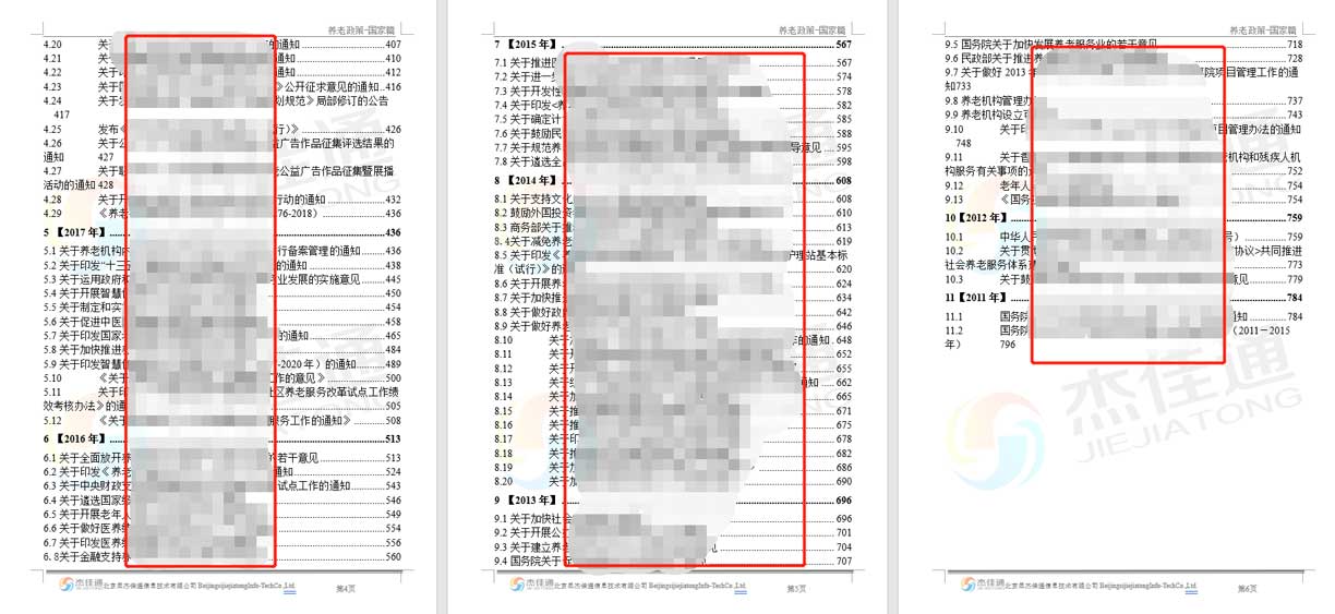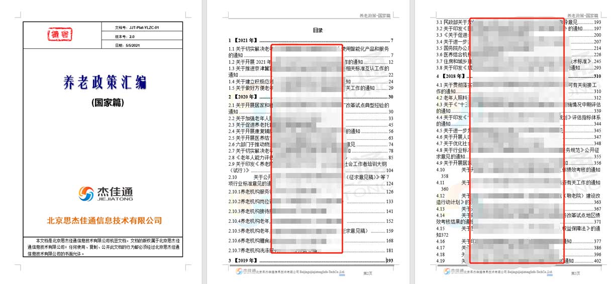 杰佳通在16年的智慧養(yǎng)老研發(fā)和建設中,不斷總結(jié):如何讓養(yǎng)老運營單位少走彎路,快速實現(xiàn)盈利,除不斷完善《養(yǎng)老運營匯編》一書外,近期也編制了《養(yǎng)老政策匯編》系列書,分為國家篇和地方政府篇,其中國家篇一書,總頁數(shù)為八百多頁,供我們的合作伙伴參考。